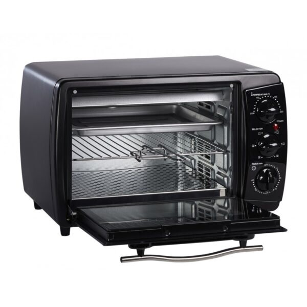 Φτάνει σε μέγιστη θερμοκρασία 250° και είναι εξοπλισμένο με αυτόματο χρονόμετρο (0 έως 60 λεπτά), 3 ράφια και μια πένσα για την αφαίρεση των ραφιών.